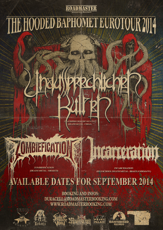 It is with great pride that the agency Roadmaster Booking announces the European tour of one of the greatest representatives of the Chilean underground Death Metal scene, the UNAUSSPRECHLICHEN KULTEN. The tour will be in September 2014 and will also feature ZOMBIEFICATION (Mexico) and INCARCERATION (Brazil / Germany).